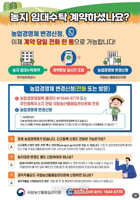 (비씨엔뉴스24) 국립농산물품질관리원과 한국농어촌공사(사장 이병호)는 기관 간 협업을 통해 농업경영체 시스템(농관원)과 농지은행 시스템(한국농어촌공사)을 실시간으로 연계하여 지난 2월 13일부터 농업인이 임대수탁계약 완료와 동시에 농업경영체 변경등록까지 한번에(One-stop) 처리할 수 있는 서비스를 제공한다.