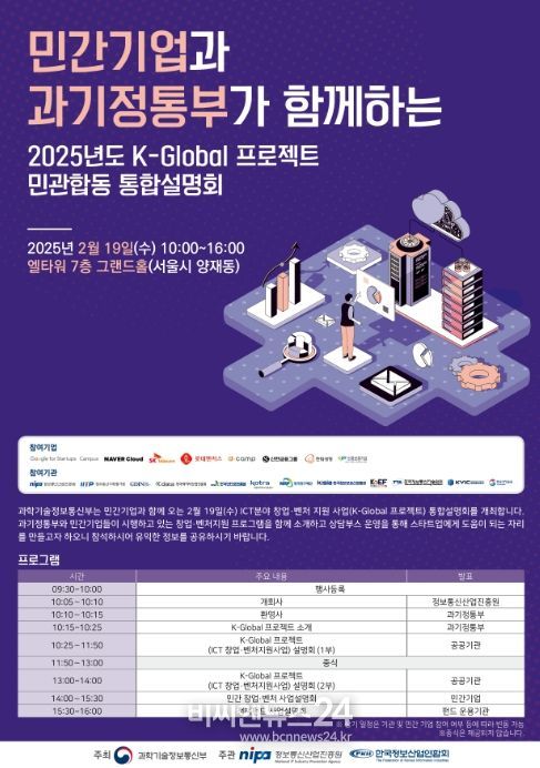 (비씨엔뉴스24) 과학기술정보통신부는 '한국형 국제 사업(K-글로벌 프로젝트)'의 2025년 대상 사업들을 소개하는 통합안내문을 공고하고, 사업에 참여하는 민간·공공의 지원 사업들을 소개하는 민·관 합동 통합설명회를 2월 19일, 서울 양재동 엘타워에서 개최했다고 밝혔다.
