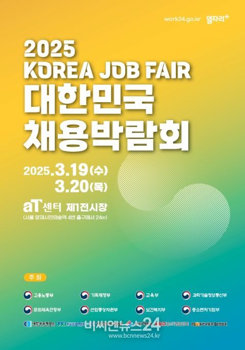 (비씨엔뉴스24) 정부(고용노동부ㆍ기획재정부ㆍ교육부ㆍ과학기술정보통신부ㆍ문화체육관광부ㆍ산업통상자원부ㆍ보건복지부ㆍ중소벤처기업부)는 3월 19일부터 3월 20일까지 이틀간 aT센터 제1전시장(서울 서초구 강남대로 27)에서 「2025 대한민국 채용박람회」를 개최한다.
