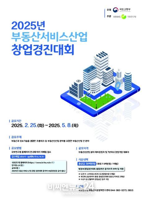 (비씨엔뉴스24) 국토교통부는 부동산과 프롭테크(Prop Tech) 분야 최신 정보기술을 결합한 부동산서비스산업 분야 새싹기업을 지원하기 위해 '2025 부동산서비스산업 창업경진대회'의 참가자를 2월 25일부터 모집한다고 밝혔다.