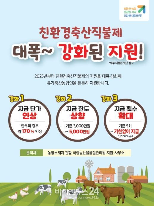(비씨엔뉴스24) 농림축산식품부 국립농산물품질관리원은 3월 4일부터 친환경축산물(유기축산물) 인증을 받은 축산 농가를 대상으로 2025년도 친환경축산직불금사업 신청을 받는다.