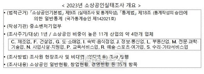 (비씨엔뉴스24) 중소벤처기업부와 소상공인시장진흥공단(이사장 박성효)은 27일 '2023년 소상공인실태조사'의 잠정결과를 발표했다. 소상공인실태조사는 소상공인·자영업자 지원정책 수립을 위한 기초자료로 활용되며, 매년 시행되고 있다.