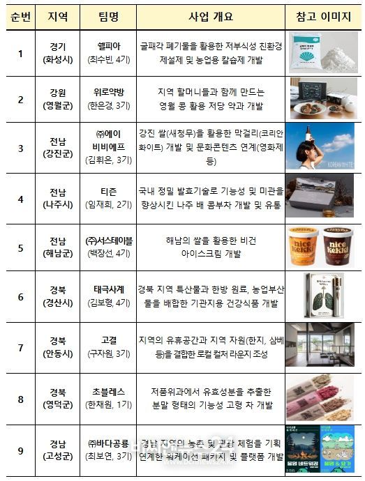 △농업·농촌과의 관련성, △지역경제 기여도, △경쟁력 및 지속 가능성을 종합적으로 평가한 결과 사업대상자로 선정된 9개소는 영월 콩, 강진 쌀, 안동 고택 등을 활용하여 농촌자원의 부가가치를 높였을 뿐만 아니라 지역 어르신 고용, 농촌의 문화·관광 콘텐츠 다변화에 기여한다는 점에서 전문가들의 높은 점수를 획득했다. 농식품부 및 지자체는 9개 팀들이 농촌에서 해당 사업모델을 더욱 확장 시킬 수 있도록 팀 당 1억 원의 사업화자금 및 관련 사업을 연계할 예정이다.