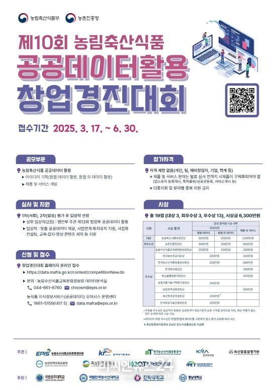 (비씨엔뉴스24) 농림축산식품부는 농진청 등 10개 농식품 관계기관과 함께 4개 대학으로부터 후원을 받아 ‘제10회 농림축산식품 공공데이터 활용 창업경진대회’를 개최한다.