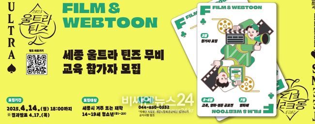 (비씨엔뉴스24) 세종시문화관광재단은 청소년들의 영상예술 역량을 키우고 창의적인 진로 탐색을 지원하기 위해 ‘세종 울트라 틴즈 무비’ 교육 참가자를 모집한다.