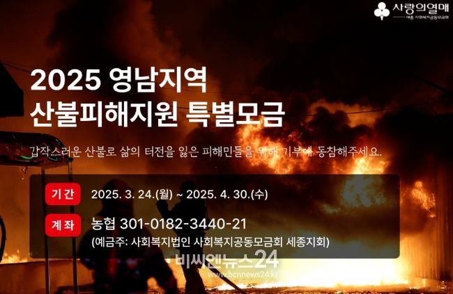 세종사회복지공동모금회는 4월 30일까지 영남지역에서 발생한 대형화재로 삶의 터전을 잃은 피해민을 돕기 위하여 『2025 영남산불 피해지원 특별모금』을 전개한다고 25일 밝혔다.