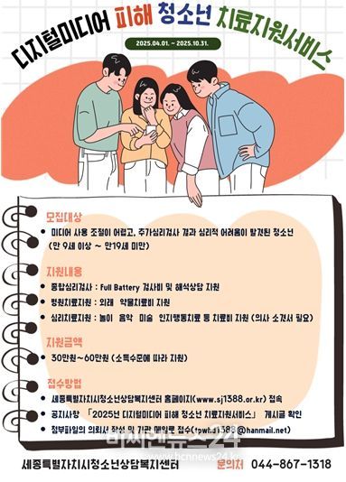 (비씨엔뉴스24) 세종특별자치시청소년상담복지센터는 지역사회 청소년들의 건강한 성장을 돕기 위해, 4월부터 10월까지 미디어 사용 조절 관련 어려움을 겪고 있는 청소년들을 위한 치료지원서비스를 제공한다.