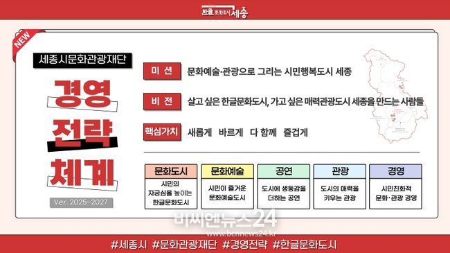 (비씨엔뉴스24) 세종시문화관광재단(대표이사 박영국)이 ‘살고 싶은 한글문화도시, 가고 싶은 매력관광도시 세종을 만드는 사람들’이라는 새로운 비전을 발표했다. 이는 문화예술과 관광을 중심으로 대한민국 대표 문화도시가 되겠다는 강한 의지를 반영한 것이다.