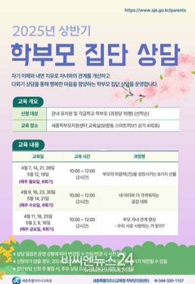 (비씨엔뉴스24) 세종특별자치시교육청은 4월 7일부터 5월 21일까지 학부모지원센터에서 세종시 내 희망하는 학부모를 대상으로 ‘학부모 마음 살핌 집단 상담’을 운영한다.