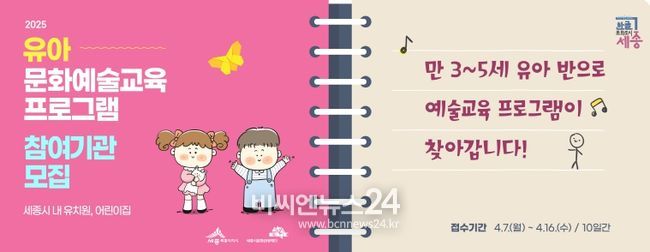 (비씨엔뉴스24) 세종시문화관광재단은 유아기의 창의성과 감수성 발달을 위해 세종시 관내 유아 기관을 대상으로 유아 문화예술교육 지원 프로그램 참여 기관60곳을 모집한다고 밝혔다.