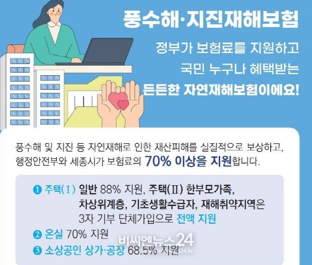 (비씨엔뉴스24) 세종특별자치시가 각종 자연재난으로부터 시민들의 재산 피해를 보상하는 풍수해보험료를 지원 중이라고 10일 밝혔다.