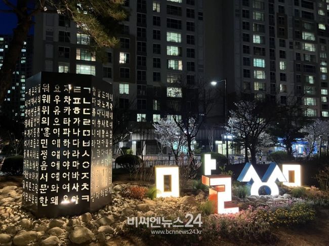 기둥 주변에는 ‘나랏말씀’을 형상화한 자음·모음 조형물과 전통적인 오방색 발광 다이오드(LED) 조명을 배치해 한글의 아름다움을 표현했다.