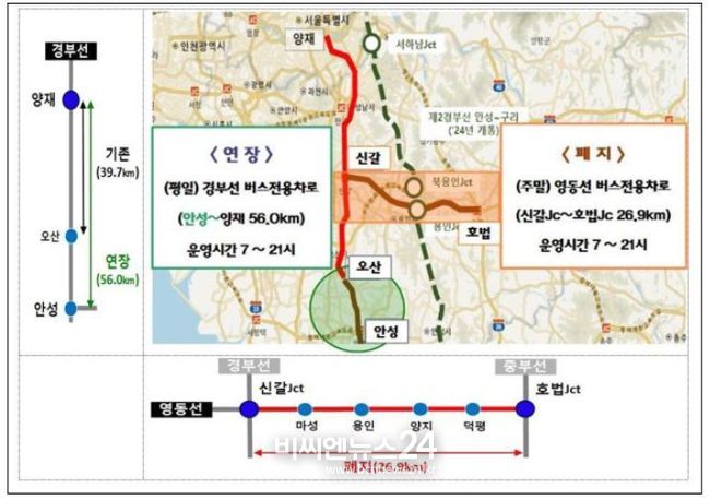 (비씨엔뉴스24) 국토교통부와 경찰청은 평일 경부선 고속도로 버스전용차로 구간을 안성나들목(총 56.0km)까지 연장하고, 주말 영동선 고속도로 버스전용차로 구간을 폐지한다.