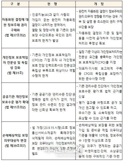3월 15일 시행되는 개정법에는 인공지능(AI)의 확산에 따른 자동화된 결정 영역에서 국민의 권리를 신설하고, 개인정보를 보다 전문적으로 보호하기 위해 대량 또는 민감한 개인정보를 처리하는 기업ㆍ공공기관 등의 개인정보 보호책임자(CPO) 자격 요건을 강화하는 등의 내용이 포함되어 있어 개정사항을 꼼꼼하게 확인해야 한다.