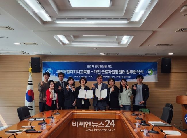 (비씨엔뉴스24) 세종특별자치시교육청은 4월 21일에 세종시교육청 중회의실에서 대전근로자건강센터와 ‘근로자 건강증진을 위한 업무협약(MOU)’을 체결했다.