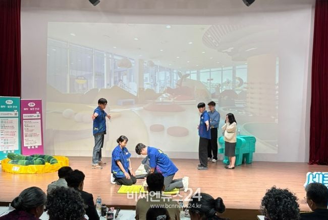 이들은 연극 형태로 심정지 상황 재연, 119신고 요청, 심폐소생술, 제세동기 사용 등을 제한 시간 8분 이내에 수행했다.