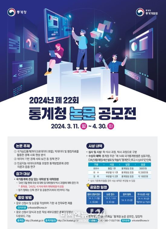 (비씨엔뉴스24) 통계청은 통계 연구에 관심이 있는 대학(원)생을 대상으로 3월 11일부터 6월 30일까지 통계청 논문 공모전을 개최한다고 밝혔다.