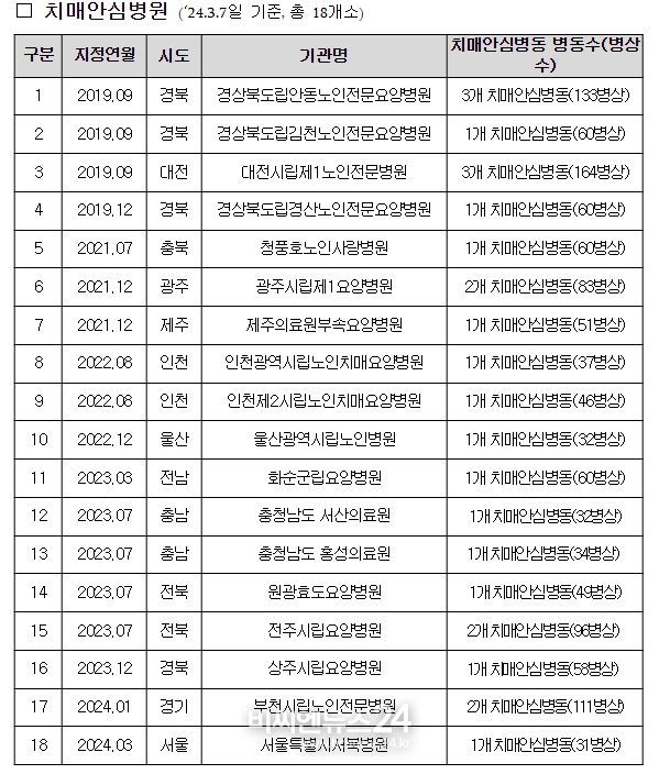 보건복지부는 2019년부터 치매안심병원 지정 제도를 운영하고 있으며, 병원급 의료기관으로서 치매관리법령상 요건(인력, 시설·장비 등)을 갖춘 기관이 지정을 신청하면 요건 충족 여부를 확인하여 지정할 수 있다.