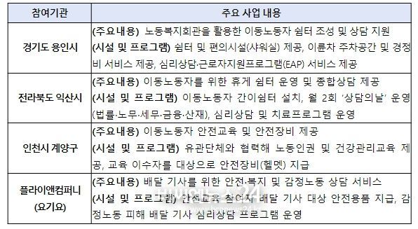 이번에 선정된 경기도 용인시는 자치단체 소유 노동복지회관의 유휴공간을 활용해 플랫폼종사자 쉼터를 조성하고, 폭염 속에서 일하는 배달 기사 등 열악한 노무 제공 환경에 노출된 종사자들을 위해 샤워실을 개방할 계획이다. 아울러, 이륜차 경정비 서비스, 심리상담·근로자지원프로그램(EAP) 서비스 등도 제공할 예정이다.