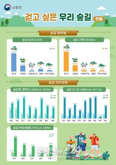 (비씨엔뉴스24) 산림청은 지난 ’22년부터 약 2년에 걸쳐 우리나라 숲길을 일제 정비한 결과 등산로‧트레킹길 등 전국에 조성된 구간이 총 8천여 개 약 3만 9천km에 달한다고 8일 밝혔다.