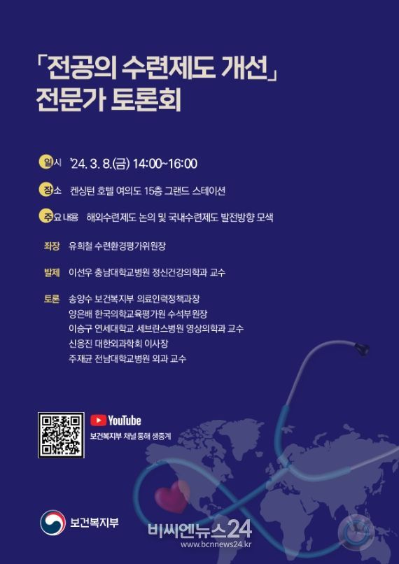 (비씨엔뉴스24) 보건복지부는 3월 8일 오후 2시 여의도 캔싱턴호텔에서 전공의 수련제도의 개선방향 논의를 위한'전공의 수련제도 개선 전문가 토론회'를 개최했다.