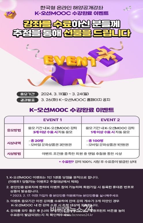 (비씨엔뉴스24) 해양수산부는 누구나 무료로 바다를 주제로 한 강연을 들을 수 있는 온라인 공개강좌 누리집(K-오션MOOC)에 신규 강좌 업로드를 기념하여 3월 11일부터 수강자를 대상으로 이벤트를 개최한다. 3월 11일부터 3월 24일까지 총 14일간 강좌 1개 이상 수료자 중 추첨을 통해 모바일 기프티콘도 제공하며, 자세한 내용은 누리집을 통해 확인할 수 있다.