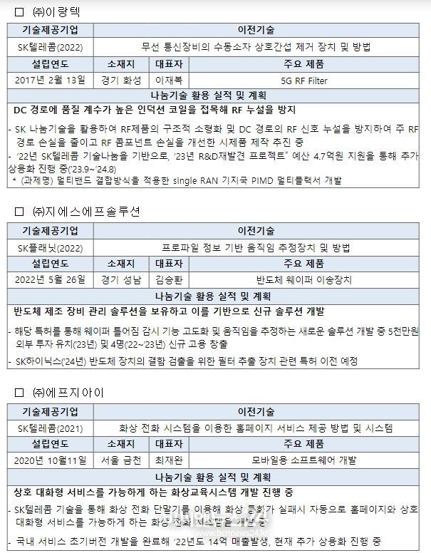 2014년부터 기술나눔에 참여하고 있는 SK그룹은 현재까지 315건의 특허를 197개의 기업에 무료로 이전하여 이전한 특허의 수 및 수혜기업의 수에서 우수한 실적을 보여주고 있다.
