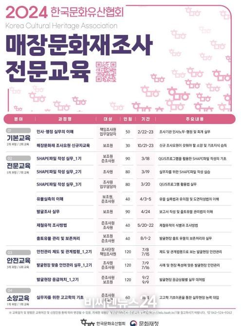 (비씨엔뉴스24) 문화재청은 (사)한국문화유산협회(회장 김창억)와 함께 11월까지 매장유산 조사인력의 역량·전문성 및 안전의식 향상을 위하여 '2024년도 매장유산조사 분야 전문교육'을 시행한다. 교육 대상은 발굴조사기관, 박물관, 연구소 등에 재직하는 매장유산 조사인력을 비롯하여 관련학과 대학(원)생, 지자체·공공기관의 업무담당자 등이다.