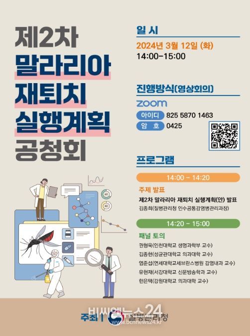 (비씨엔뉴스24) 질병관리청은 3월 12일 오후 2시 비대면(온라인)으로 '제2차 말라리아 재퇴치 실행계획(안) 공청회'를 개최했다고 밝혔다.