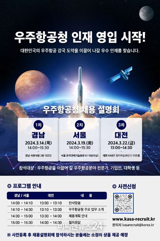 (비씨엔뉴스24) 과학기술정보통신부 우주항공청설립추진단은 2024년 3월 14일부터 3월 22일까지 3차례에 걸쳐 “찾아가는 우주항공청 채용설명회”를 시작으로 본격적인 우주항공청 인재 채용 절차에 돌입한다고 밝혔다.