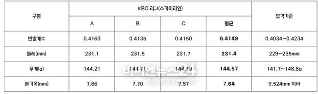 이번 검사는 KBO 리그 단일 경기사용구인 ㈜스카이라인스포츠 AAK-100의 샘플 3타를 무작위로 수거한 뒤 지난 26일(금)부터 29일(월)까지 국민체육진흥공단(KSPO) 한국스포츠개발원 스포츠용품 시험소에 의뢰해 진행했다. 검사 결과, 모든 샘플이 합격기준을 충족한 것으로 확인됐다.