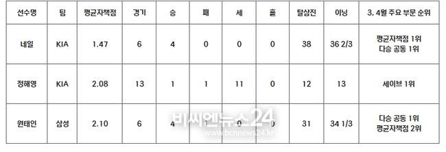 (비씨엔뉴스24) 4월까지 200만 명이 넘는 관중이 야구장에 들어서며 2024 신한 SOL뱅크 KBO 리그는 뜨거운 시작을 알렸다. 뜨거운 개막 열기만큼 불타는 활약을 펼친 3, 4월 월간 MVP 후보로 총 7명의 선수가 선정됐다. 투수 중에서는 KIA 네일, 정해영, 삼성 원태인 야수 중에서는 KT 강백호, SSG 에레디아, 최정, KIA 김도영이 후보로 선정돼 3~4월 MVP 수상을 노린다.