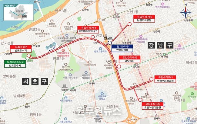 이번에 결정된 강남역 일대 빗물배수터널은 기습 폭우 시 기존 하수관로의 빗물을 수직구를 통해 터널로 유입하고, 반포유수지에 설치된 유출수직구를 통해 반포천으로 배제하는 방식이다.