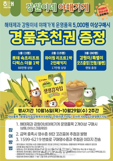 출시 기념으로 매대 내 상품을 5,000원 이상 구매한 고객에게 경품 응모권을 제공하며, 추첨을 통해 도내 리조트 숙박권과 강원이‧특별이 한정판 굿즈를 증정한다.