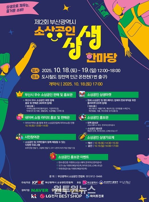 (원투원뉴스) 부산시는 오는 10월 18일부터 19일까지 2일간 금정구 장전역 인근 온천천 일원에서 '제2회 부산시 소상공인 상생한마당' 행사가 개최된다고 밝혔다.