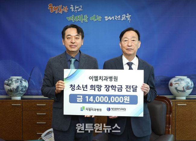 (원투원뉴스) 대전시교육청은 10월 15일 이엘치과병원으로부터 학생장학금 1,400만원을 전달받았다고 밝혔다.
