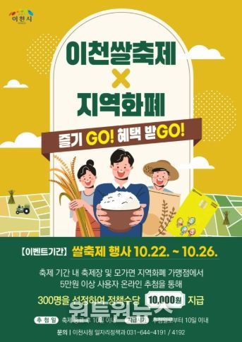 (원투원뉴스) 이천시는 2025 이천쌀문화축제 기간에 지역화폐 이용을 촉진하고 지역경제를 활성화하기 위해 코나아이(주)의 경기지역화폐 사회공헌 재원을 활용하여 ‘이천쌀축제, 지역화폐로 즐기고(GO), 혜택받고(GO)’ 이벤트를 추진한다고 밝혔다.