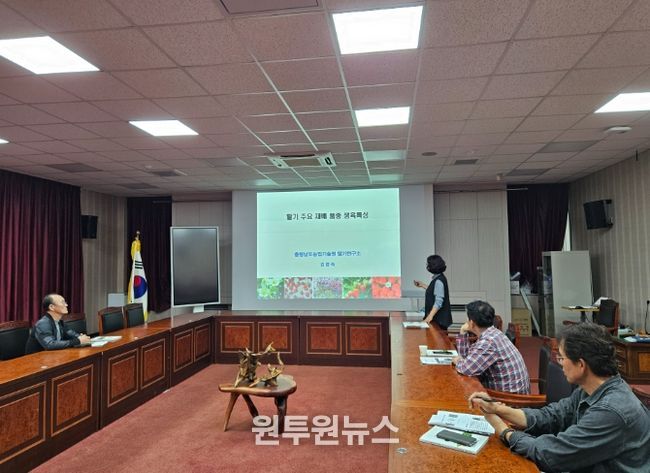 (원투원뉴스) 청양군은 지난 15일 군 농업기술센터에서 관내 딸기 재배농가와 관심 농업인 10여 명을 대상으로 ‘2025년 딸기 기본 교육’을 실시했다.