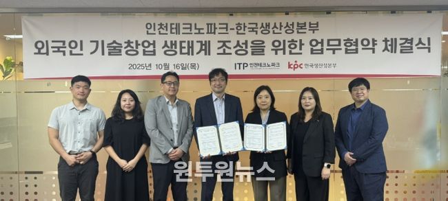 (원투원뉴스) 인천테크노파크는 지난 16일 한국생산성본부와 ‘외국인 창업 활성화 및 창업 생태계 조성을 위한 업무협약(MOU)’을 체결했다.