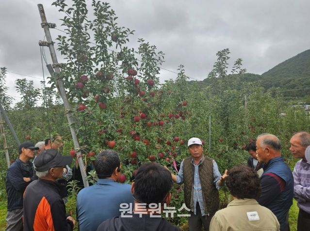 이번 견학은 곡성군 사과 재배농업인 30명이 참석한 가운데, 사과 다축 재배 기술과 과원 관리 기법을 현장에서 직접 보고 배우는 실질적인 교육의 장으로 마련됐다.