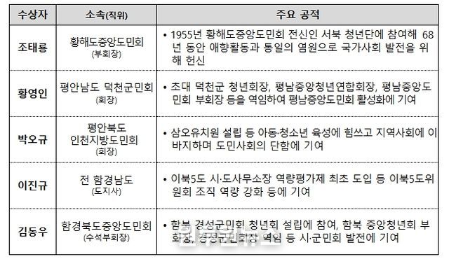 한편, 이번 대회에서는 올해 ‘국가사회발전 이북도민 유공’ 정부포상자로 선정된 39명 중 5명의 유공도민에게 국민훈장 동백장이 수여된다.