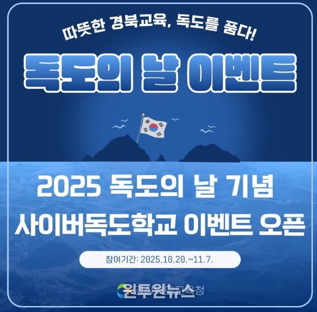 (원투원뉴스) 경북교육청은 독도의 날(10월 25일)을 맞아 20일부터 다음 달 7일까지 3주간, 전 국민이 참여할 수 있는 ‘2025 독도의 날 기념 독도사랑 온라인 축제’를 운영한다고 밝혔다.