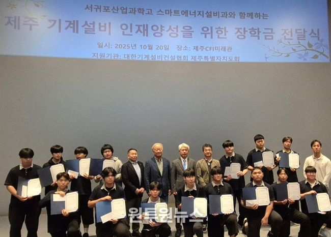 (원투원뉴스) 제주도교육청 서귀포산업과학고등학교는 20일 제주에너지공사에서 대한기계설비건설협회 제주특별자치도회로부터 스마트에너지설비과 학생들을 위한 장학금을 860만원을 전달받았다.