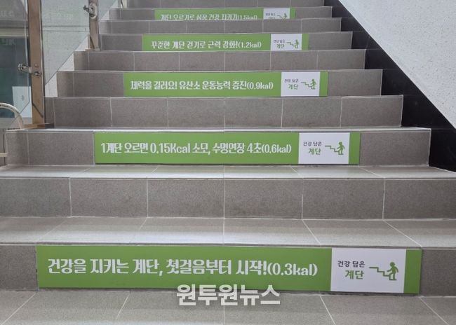계단 디딤면에는 ‘건강을 지키는 계단, 첫걸음부터 시작’, ‘꾸준한 계단 걷기로 근력 강화’, ‘집중력 향상에 좋은 건강계단’ 등 건강 문구 띠지를 부착했으며 1층 계단 벽면에는 그래픽 디자인을 적용하고 엘리베이터 문에는 계단 이용을 유도하는 안내 스티커를 설치하여 이용자들의 자발적인 참여를 유도했다.
