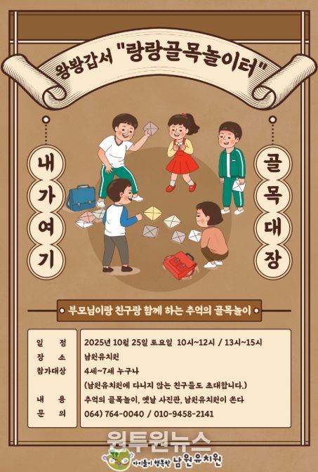 (원투원뉴스) 제주도교육청 남원유치원은 25일 오전 10시와 오후 1시, 두 차례에 걸쳐 남원유치원에서 지역공동체 교육 프로그램인 ‘왕봥갑서 랑랑골목놀이터’를 운영한다.