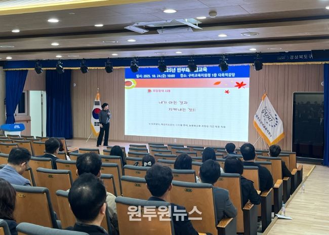 (원투원뉴스) 경상북도 구미교육지원청은 2025년 10월 24일, 구미교육지원청 1층 다목적강당에서 ‘2025년 반부패 청렴 교육’를 실시했다. 이번 교육은 관내 공립 유치원, 공·사립 초중학교 행동강령책임관 80여 명을 대상으로 반부패 청렴의 중요성을 강조하고 관내 학교까지 청렴 문화를 전파하기 위해 마련됐다.