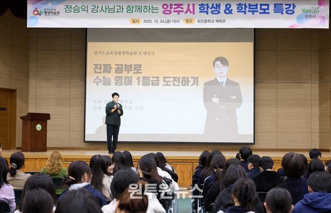 (원투원뉴스) 양주시는 지난 24일 회천중학교에서 200여 명의 학생 및 학부모가 참석한 가운데 EBS 정승익 강사를 초청하여‘2025 양주시 학부모 특강’을 성황리에 개최했다.