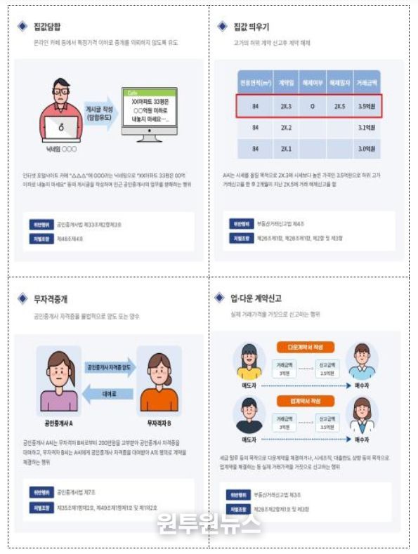 국토교통부는 집값담합, 시세교란(집값 띄우기 등) 및 인터넷 중개대상물 불법 표시·광고 등 부동산거래질서교란행위 전반에 대해 ‘부동산 불법행위 통합 신고센터’를 통해 접수 받고 있으며, 신고된 사례에 대해서는 지자체 등과 협력해 엄정 대응해 나갈 계획이다.