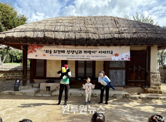 (원투원뉴스) 울산광역시교육청은 25~26일 오전 11시 30분부터 12시까지 외솔 최현배 선생 생가터에서 어린이와 가족을 대상으로 이야기 극 ‘외솔 최현배 선생님과 까막이’ 공연을 열었다.