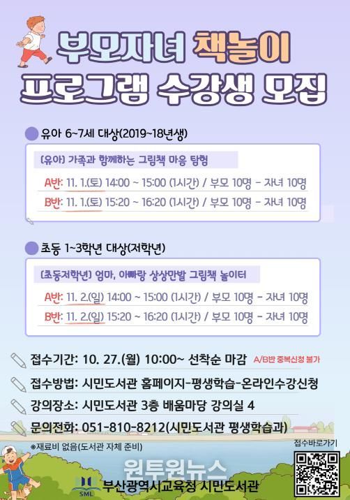 (원투원뉴스) 부산광역시립시민도서관은 다음달 1일부터 이틀간 시민도서관 배움마당 강의실에서 학부모와 자녀 80명을 대상으로 ‘하반기 부모자녀 프로그램’을 운영한다.